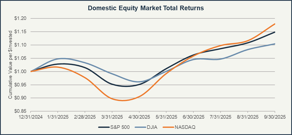 Another month, another set of all-time highs. Such has been the persistent—and often defiant—theme of equity markets throughout much of 2025. In fact, using the S&P 500 as a barometer, 6 of the last 9 months have each produced record highs for stocks. The third quarter was no exception, with the S&P, Dow, and Nasdaq all marching to new peaks in late September (S&P 500 +8.1%; DJIA +5.7%; Nasdaq +11.4%).