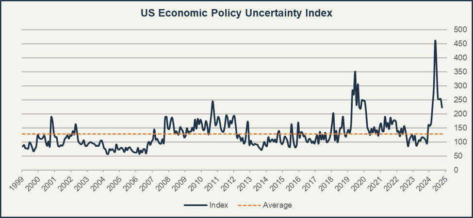 Amid the government shutdown, tariffs, and other political strife, uncertainty with regard to US economic policy remains very high, though down from peak levels earlier this year.