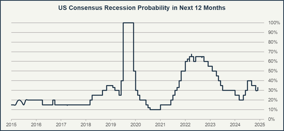 Among economists and strategists, the anticipated likelihood of a recession occurring in the next 12 months has declined from recent highs yet remains elevated compared to pre-Covid complacency.