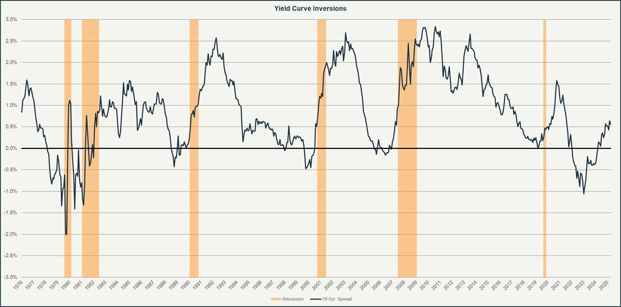As we noted in our Fall 2024 Insights, the yield curve has continued to normalize, with short-term Treasury rates in particular declining in sympathy with lower Federal Reserve policy rates. The spread between 10yr. and 2yr. Treasuries—an oft cited recession indicator—has continued to widen, suggesting some sign of relief.