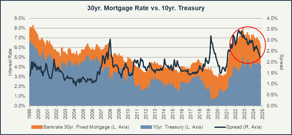 That said, a broader easing of interest rates—a much-broadcasted policy goal of the Trump Administration—has primarily been felt at the “shorter” end of the curve, while longer-term rates remain higher. This may be most relevant for consumers in the context of mortgages, which are more closely related to the 10yr. Treasury rate than short-term policy rates (i.e. the Fed Funds Rate). As a result, significant relief for current and prospective homebuyers has yet to materialize. However, the spread between the average 30yr. fixed mortgage rate and the 10yr. Treasury has begun to narrow, potentially signaling some improvement in the housing market and continued strength in homebuyer creditworthiness.
