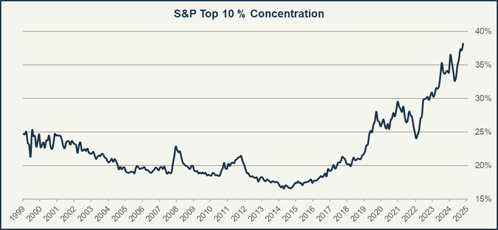 Yet the question of “where do we go from here” remains challenging. On one hand, underlying economic conditions remain relatively robust and supportive of further market gains. On the other, issues in terms of stock market concentration and frothiness among certain tech and AI-related names persist. Rather than add to the cacophony of pundits attempting to prophesize the market’s next move, below are a few charts and figures that we feel may help inform near-term expectations.
