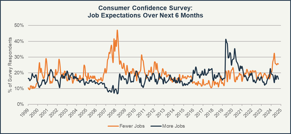 Not surprisingly, consumers’ feelings toward the job market are mixed and often stratified across income levels. However, given elevated levels of economic uncertainty, Conference Board survey participants increasingly see a tough labor market with fewer jobs available over the next six months.